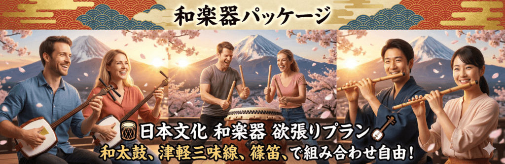 和太鼓・三味線・篠笛を一度に体験できる人気の和楽器パッケージ。